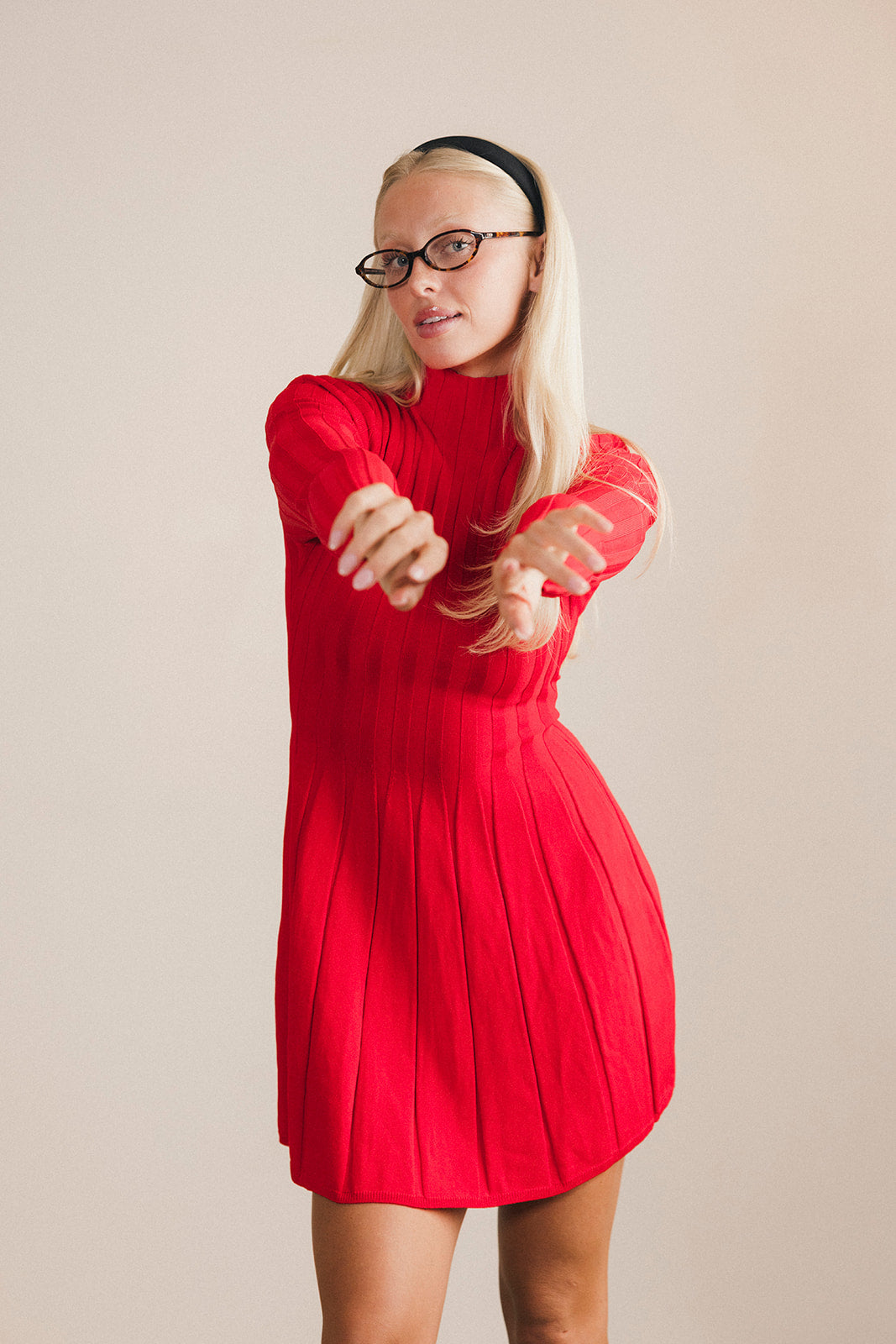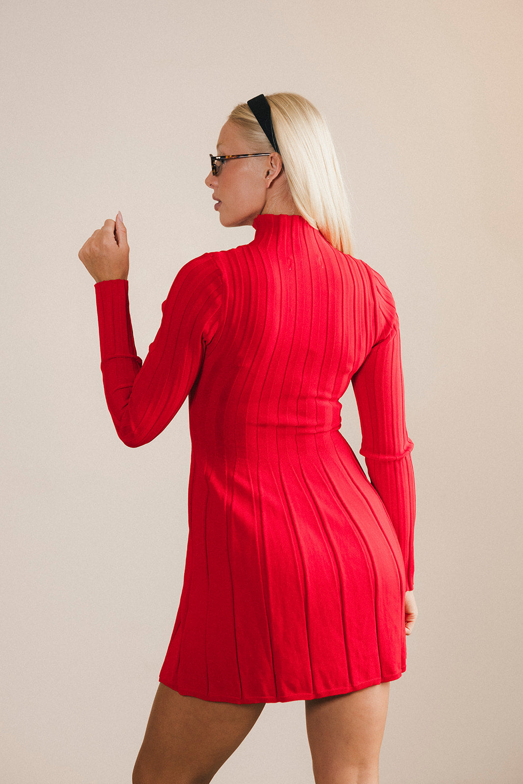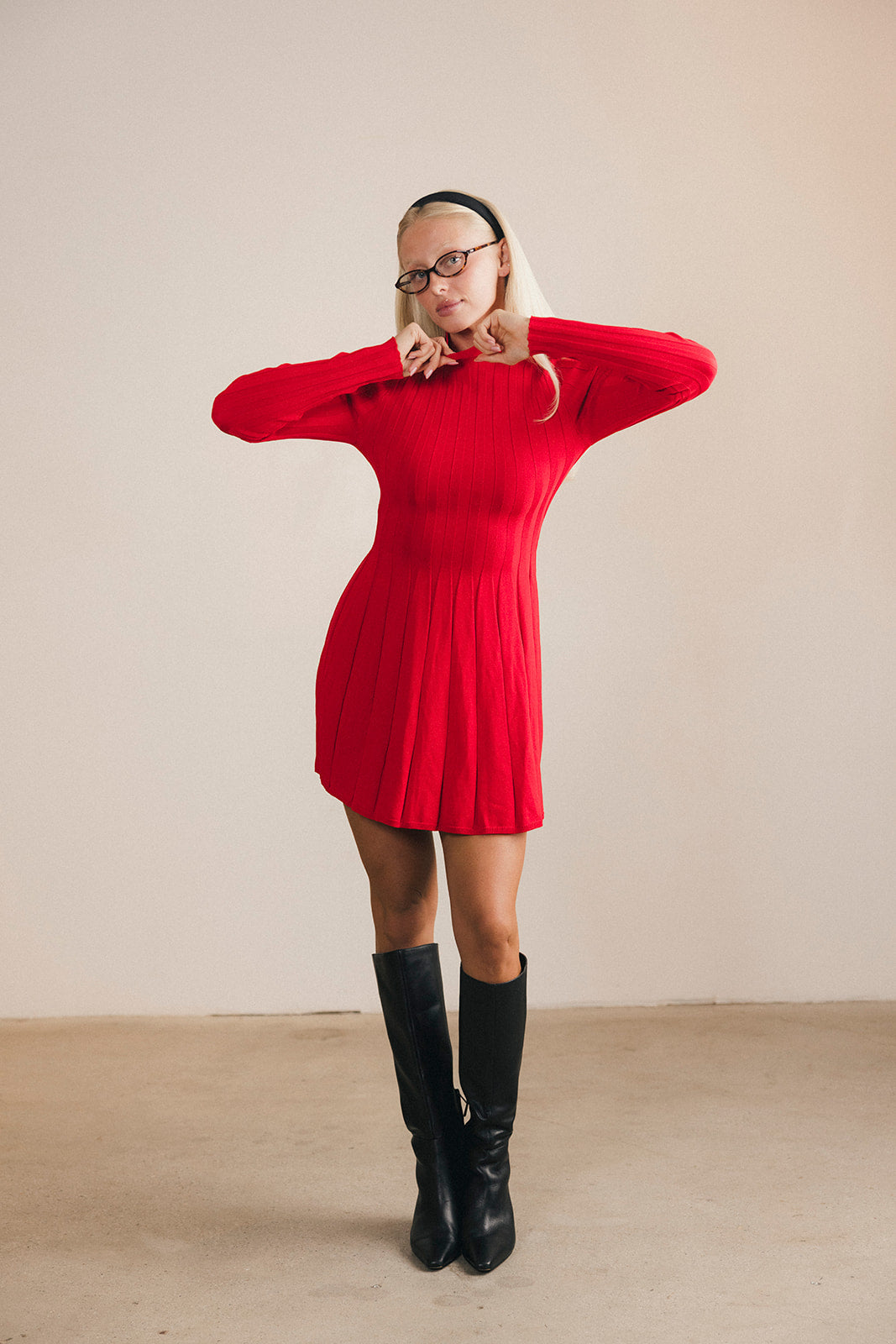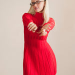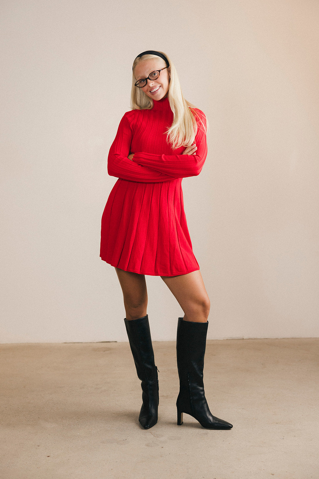 Elevate your everyday wardrobe with this sophisticated long sleeve sweater dress. The graceful pleated detailing adds dimension and movement, while the mock neck provides a polished, refined silhouette perfect for both office settings and casual outings. Crafted for comfort and style, this versatile piece transitions seamlessly from season to season, making it an essential addition to any closet. Layer it with tights and boots for a chic fall look, or pair with sneakers for effortless weekend elegance.