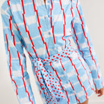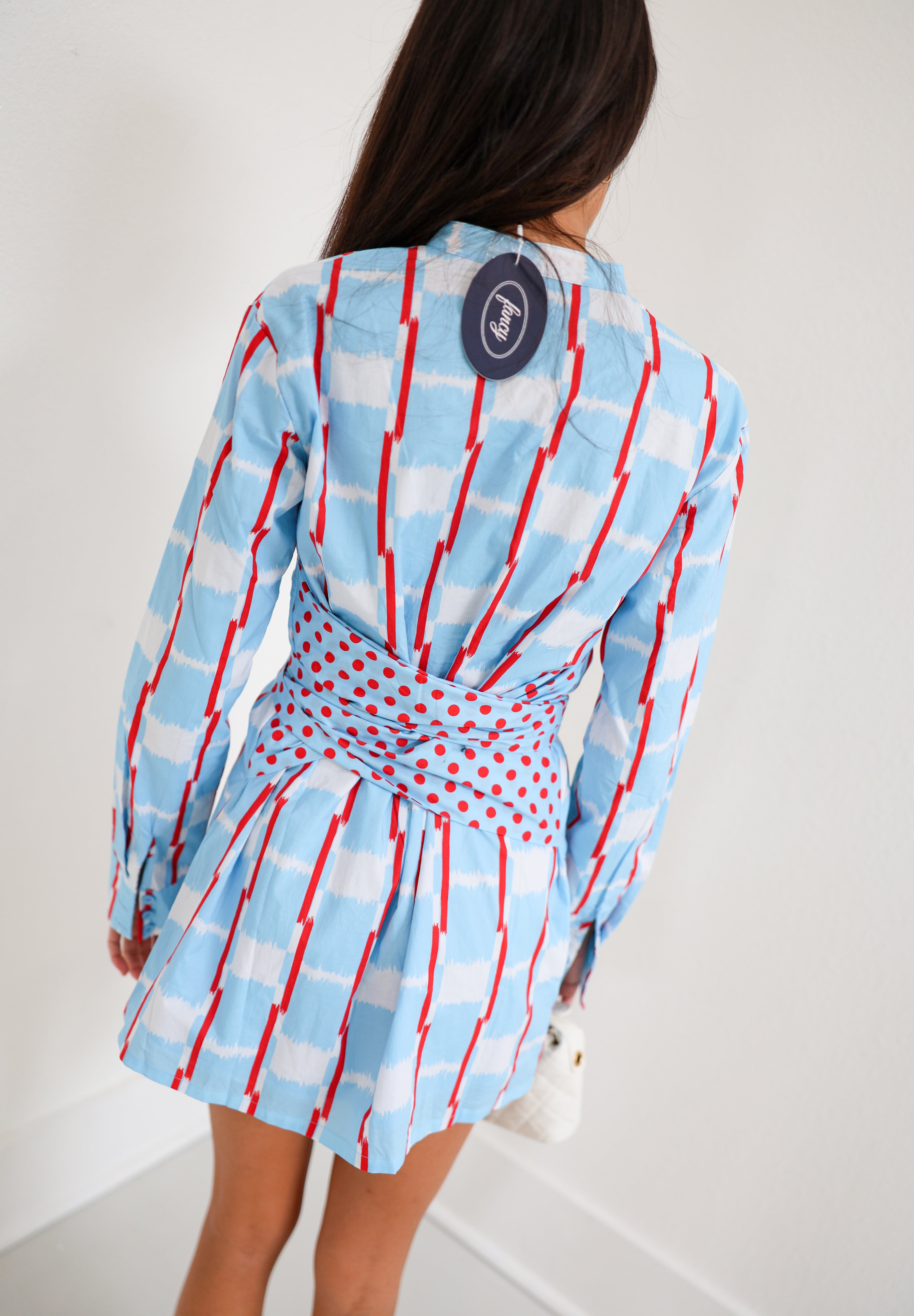 Mallie Multi Button Tie Mini Dress - Powder Blue/Red