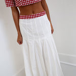 The Dani Double Layer Pleated Maxi Skirt in White and Crimson Gingham offers a charming, layered design that adds depth and movement to your look. Its soft pleats create a graceful silhouette, while the light, breathable fabric ensures comfort throughout the day. Perfect for casual outings or special occasions, this skirt combines style and ease, helping you feel confident and effortlessly chic.