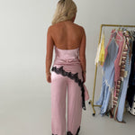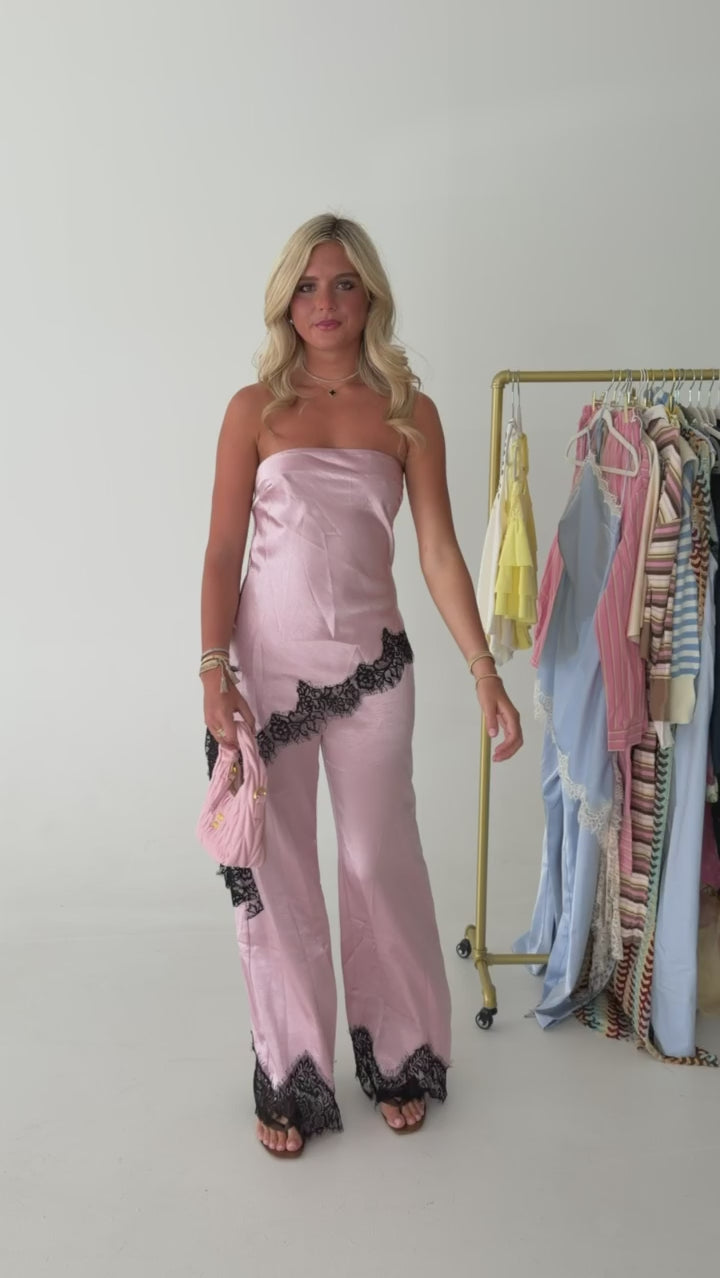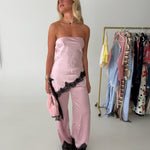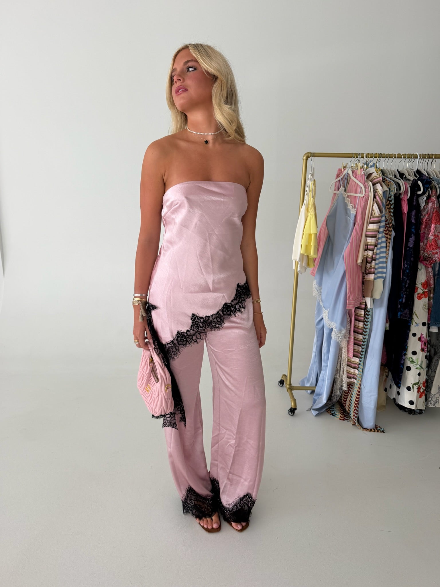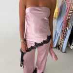 Mariah Satin Lace Trim Strapless Top and Pants Set - Pink