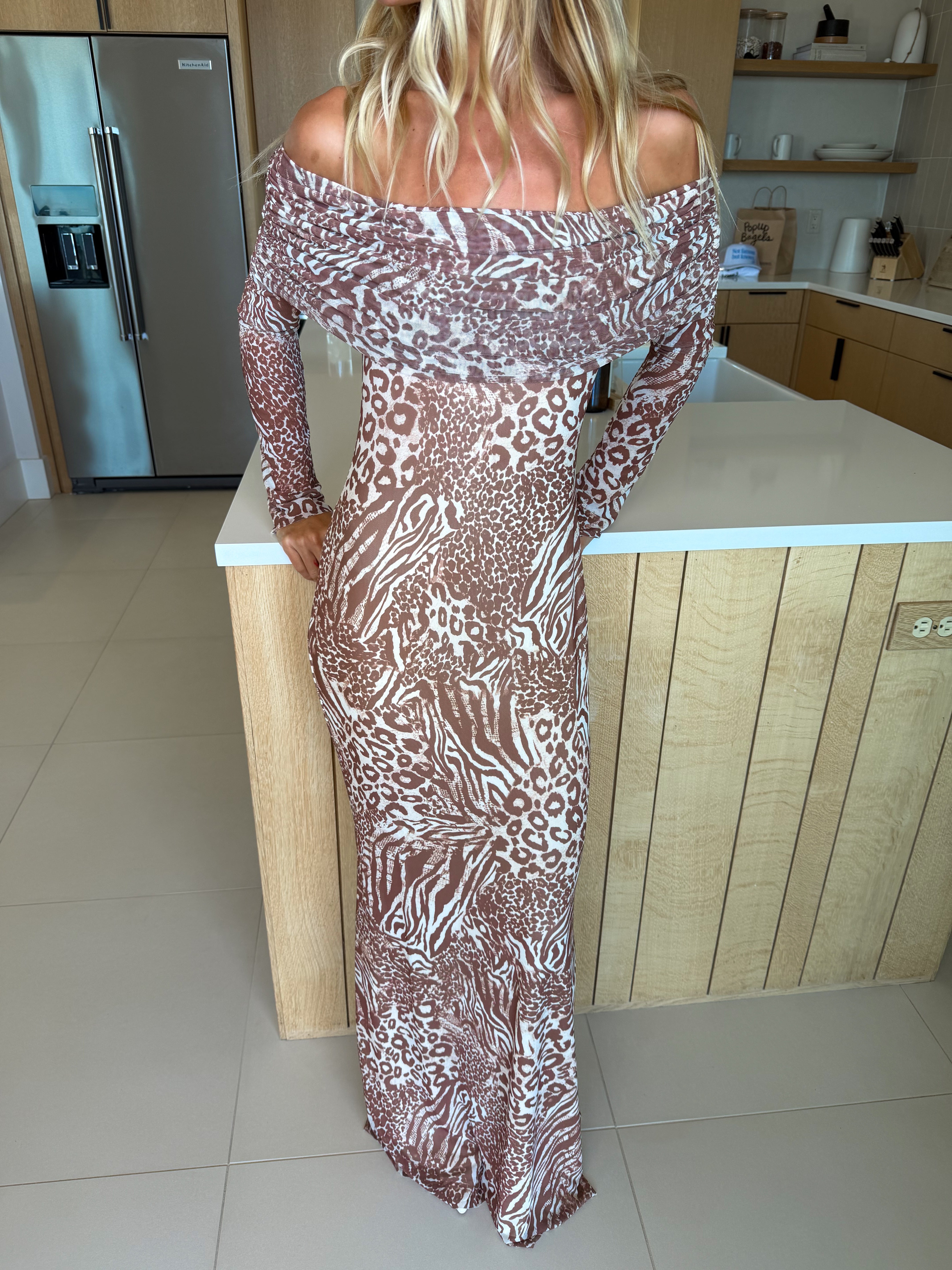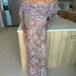 Introducing Mckayle, a stunning off-the-shoulder maxi dress that celebrates modern femininity with timeless elegance. This captivating piece features long sleeves and beautifully gathered detailing that creates movement and dimension. The exclusive taupe animal power mesh print adds a contemporary edge while maintaining sophisticated charm. Perfect for making a memorable entrance at any occasion, Thelma combines daring design with wearable comfort, allowing you to feel confident and radiant in every moment.