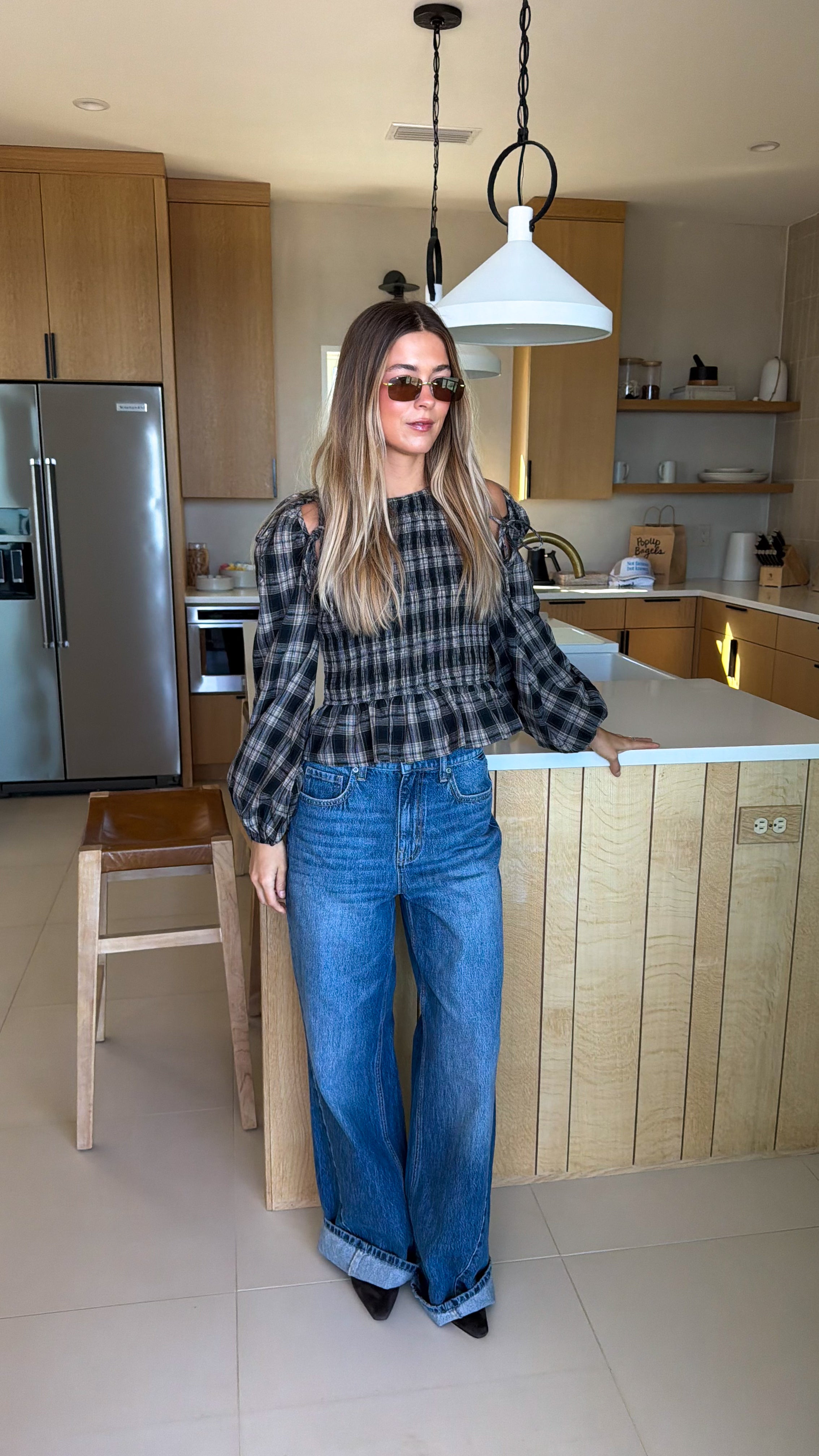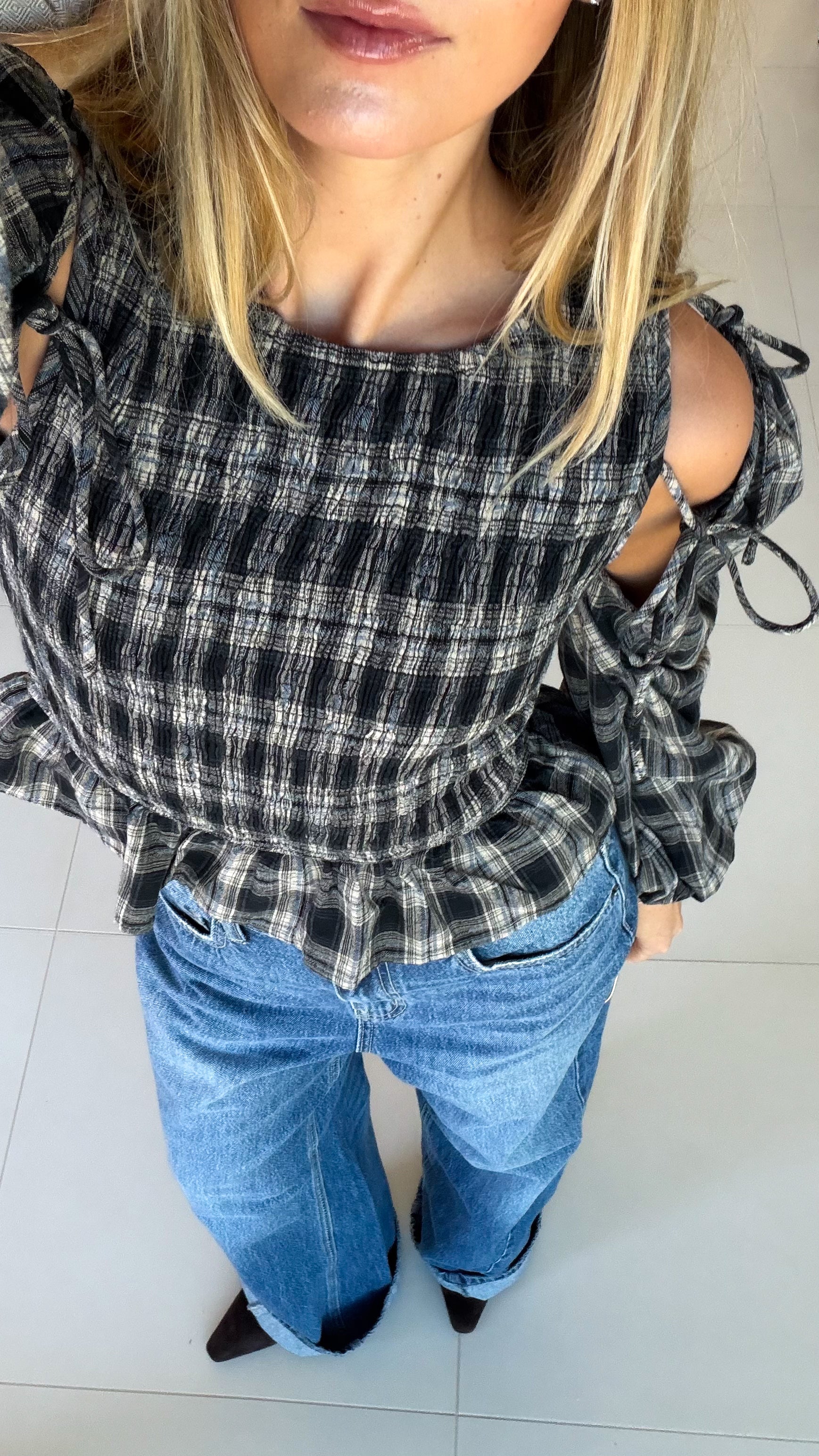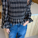Embrace effortless elegance with this charming plaid flannel peasant top. The rounded neckline and smocked bodice create a flattering silhouette, while voluminous balloon sleeves with elastic cuffs offer comfortable movement. A standout feature—detachable sleeves with tie closures—lets you transition from long sleeves to sleeveless in seconds. The playful ruffle peplum hem adds dimension and movement, making this versatile piece perfect for layering or wearing solo. Whether you're dressing up or keeping it casual, this top celebrates your individual style.