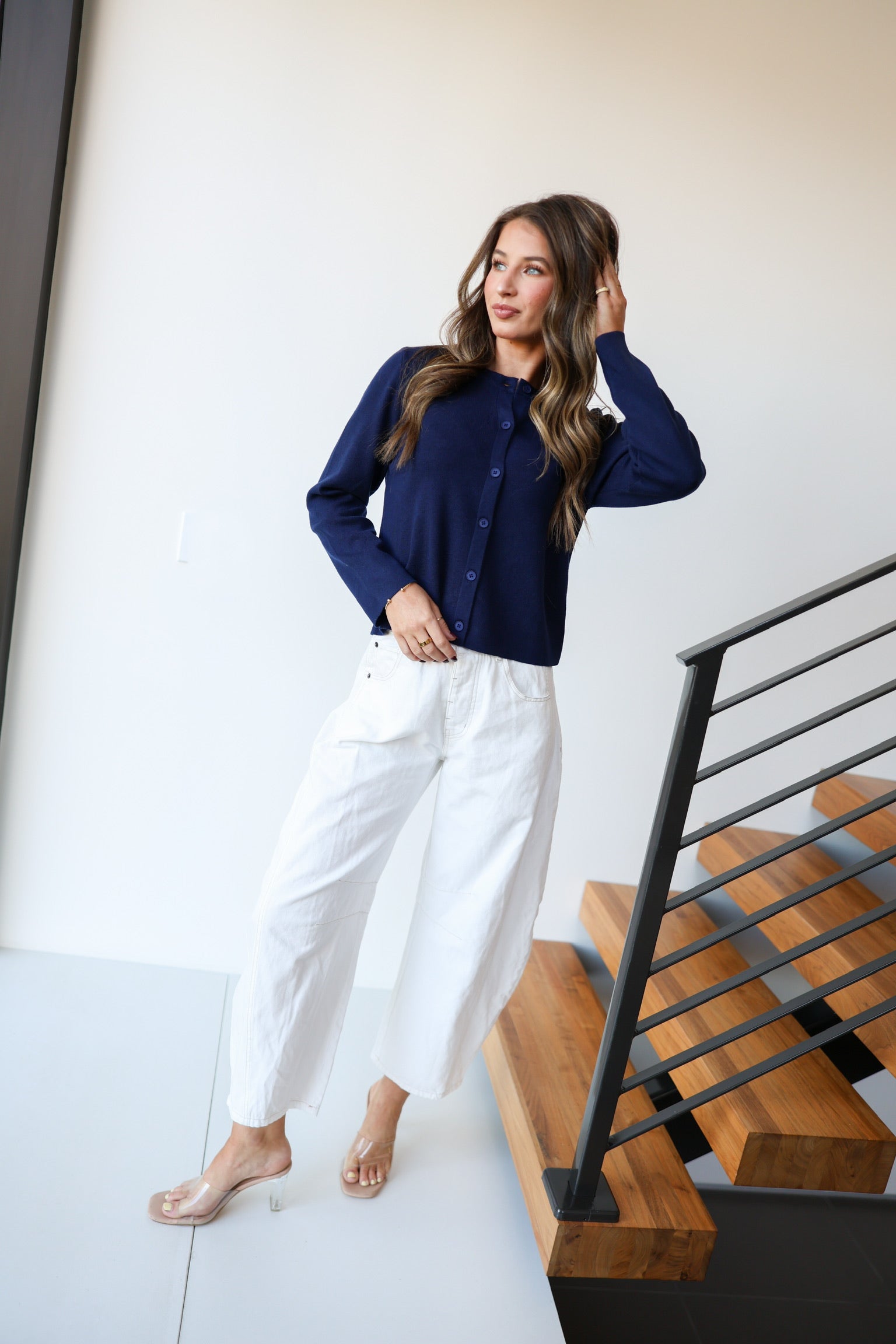 This cozy and cute fitted round neck cardigan features a soft knit fabric in a fresh navy color. Designed with a convenient front button closure, it offers both comfort and style for everyday wear. Perfect for layering, it helps you stay warm while adding a charming touch to your outfit.