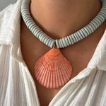Elevate your beach style with our Shoreline Shell Necklace. This exquisite necklace features a stunning coral shell paired with light blue wooden beads, creating a natural and beachy look. At 16-17" in length, it's the perfect accessory for any outfit. Embrace the beauty of the ocean with this unique and eye-catching necklace.