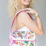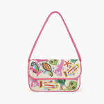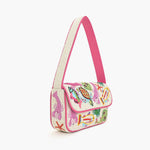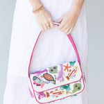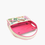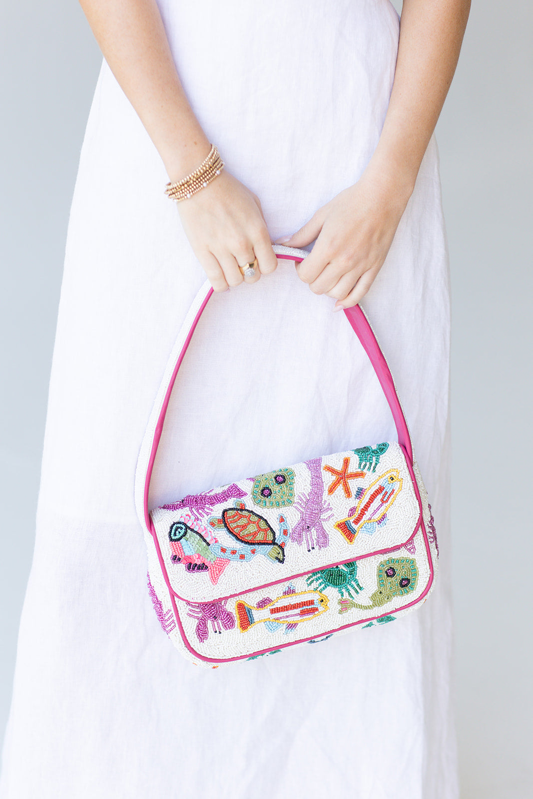 This structured shoulder bag is a total showstopper, with stunning sea-inspired embellishments that give it a truly unique charm. The soft pink PU binding adds that extra pop of luxury, while the nickel finish fittings make it shine. With a secure flap closure, hidden back pocket, and a vibrant fuchsia satin lining, this bag is as functional as it is fabulous. Whether you're dressing up or keeping it casual, this beauty is your perfect, go-anywhere accessory!