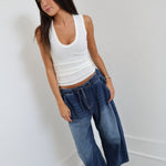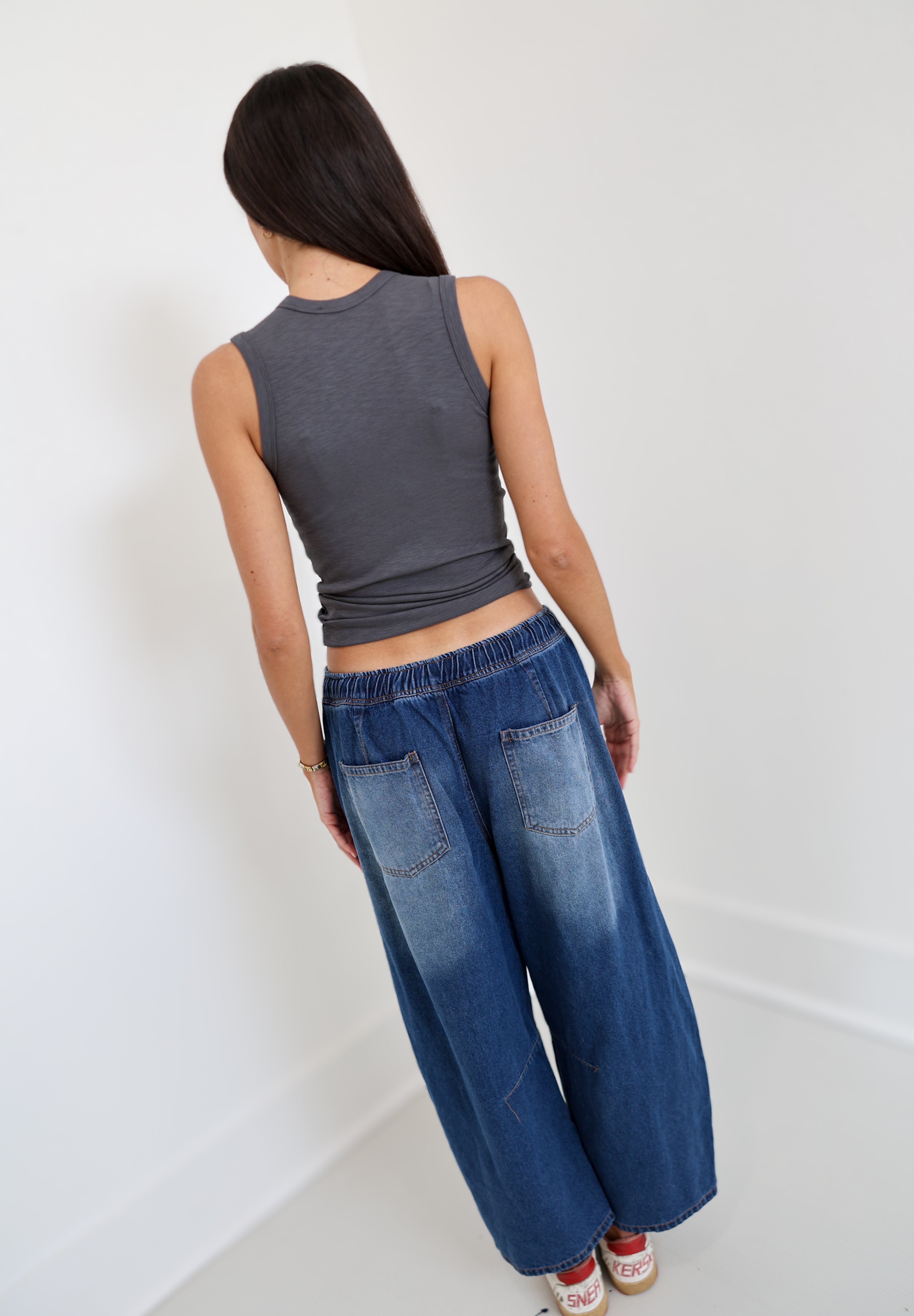 Experience comfort and style with the Whitney Barrel Pants in Dark Denim. Featuring a horseshoe cut for a flattering silhouette and a stretchy waistband, these pants offer ease of movement and a secure fit throughout your day. Perfect for those who want a blend of classic denim look with added comfort.